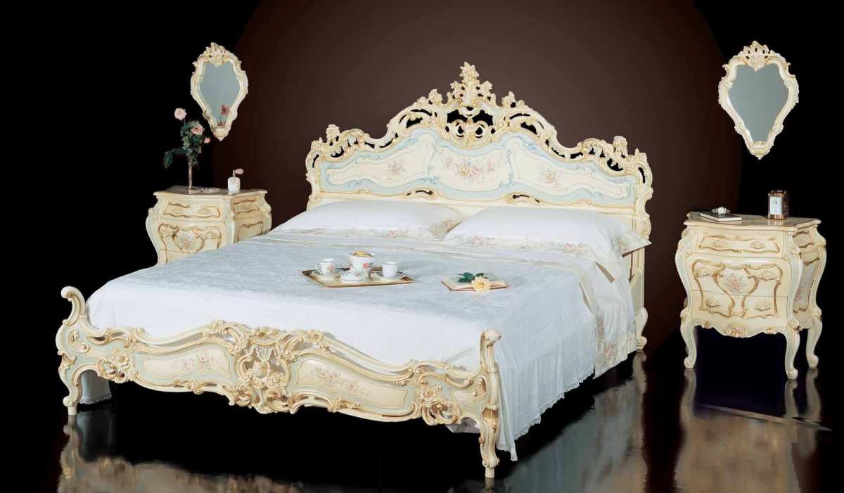 Bedroom set from the Italian manufacturer Fratelli Radice. The presented model is a double bed and bedside tables. The furniture is made on a frame of wood. Headboard and footboard decorated with a decorative carving made by hand. Finish available in white, blue and gold.