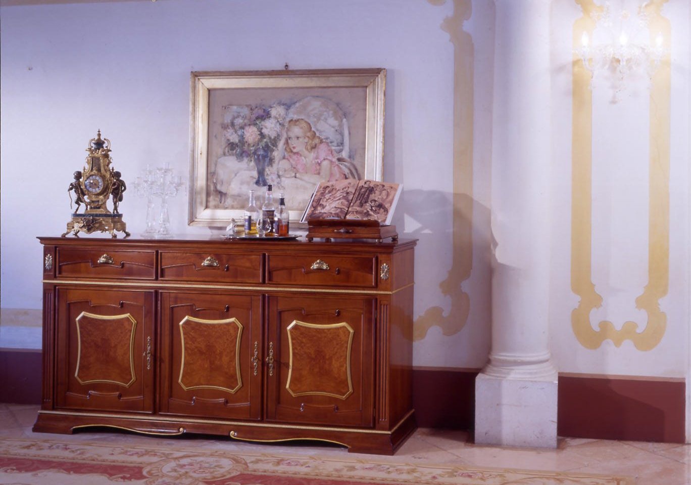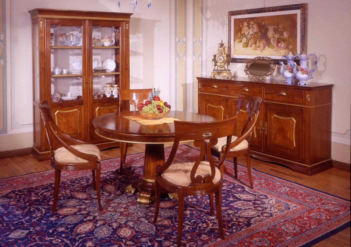 For a dining room set from the Italian manufacturer Arca. Set includes depleted table, chairs, buffet, chest of drawers. For furniture used walnut. Chairs upholstery - textiles from a range of campaigns. The furniture is characterized by the revival of ancient forms, combined with rich carving, ornament, and decoration in gold. The color of natural wood products.