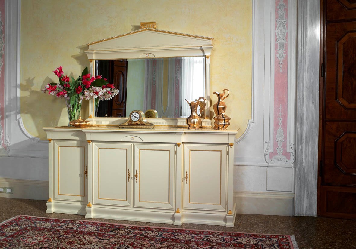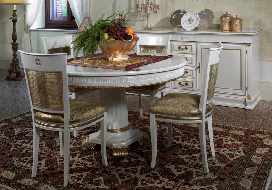 For a dining room set from the Italian manufacturer Arca. Set includes depleted table, chairs, sideboard and Cabinet. The furniture is made of solid walnut. Chairs upholstery - textiles from a range of campaigns. Characterized by the revival of ancient forms, combined with rich carving, ornament, and decoration in gold. Colours in stock.