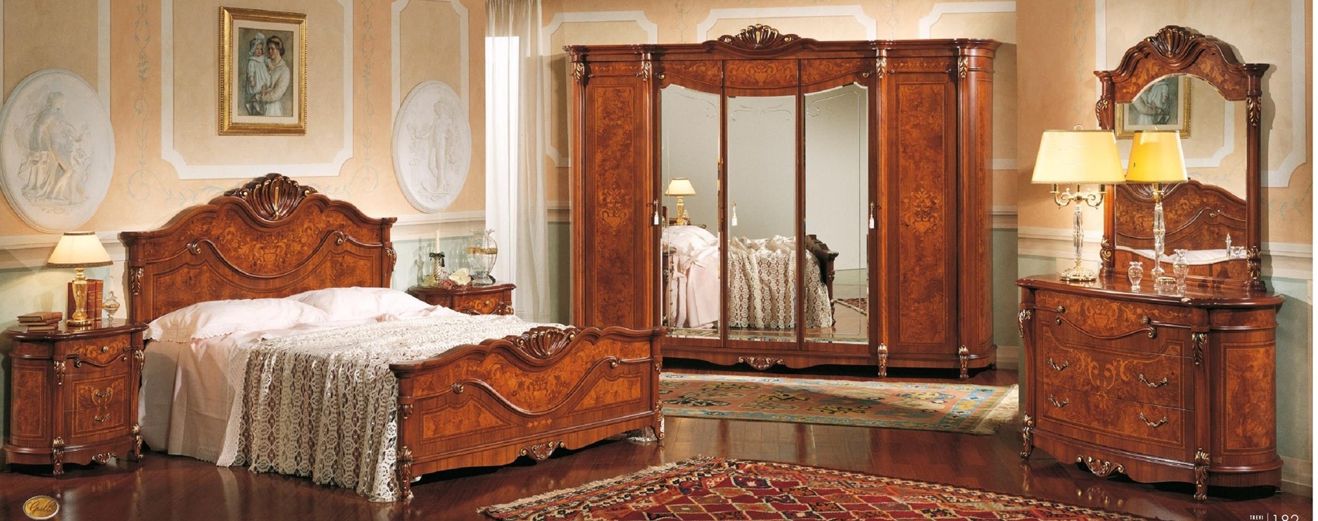 Headsets for bedrooms from Italian manufacturer Grilli. Consists of double bed, two bedside tables, chest with drawers and wardrobe. Set made in a classic style. Material - solid wood. Finish to be selected from the range of the company. The facade of the wardrobe decorated with mirror inserts. The metal fittings. Each model is decorated decorative hand carved.