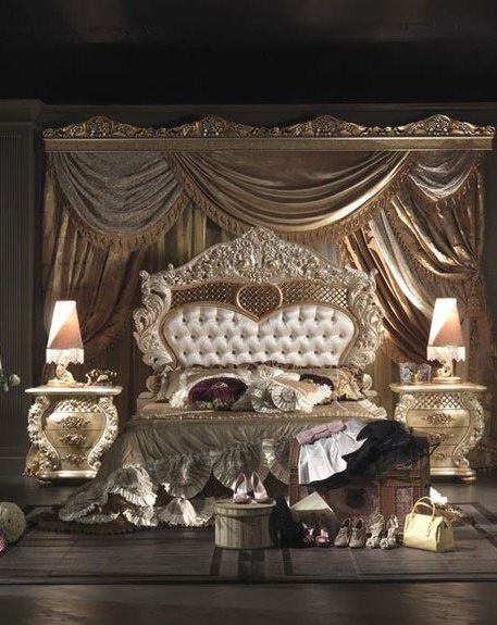 Double bed from Italian manufacturer Cappelletti. The model is made in classic style. The frame is made from solid wood. Finish to be selected from the range of the company. The head shaped form covered with a textile white. Model of decorative decorated with stitch-Capito and hand carved.