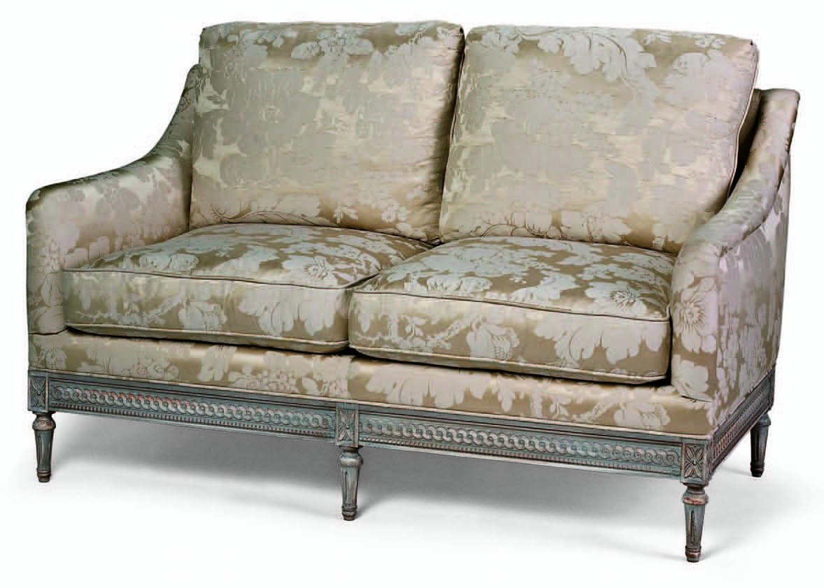 Classic double sofa Salda products. Upholstery - textiles with pictures of flowers. The frame is made from solid wood and decorated with handmade carving. Colours in stock.