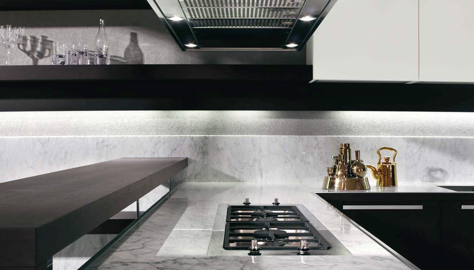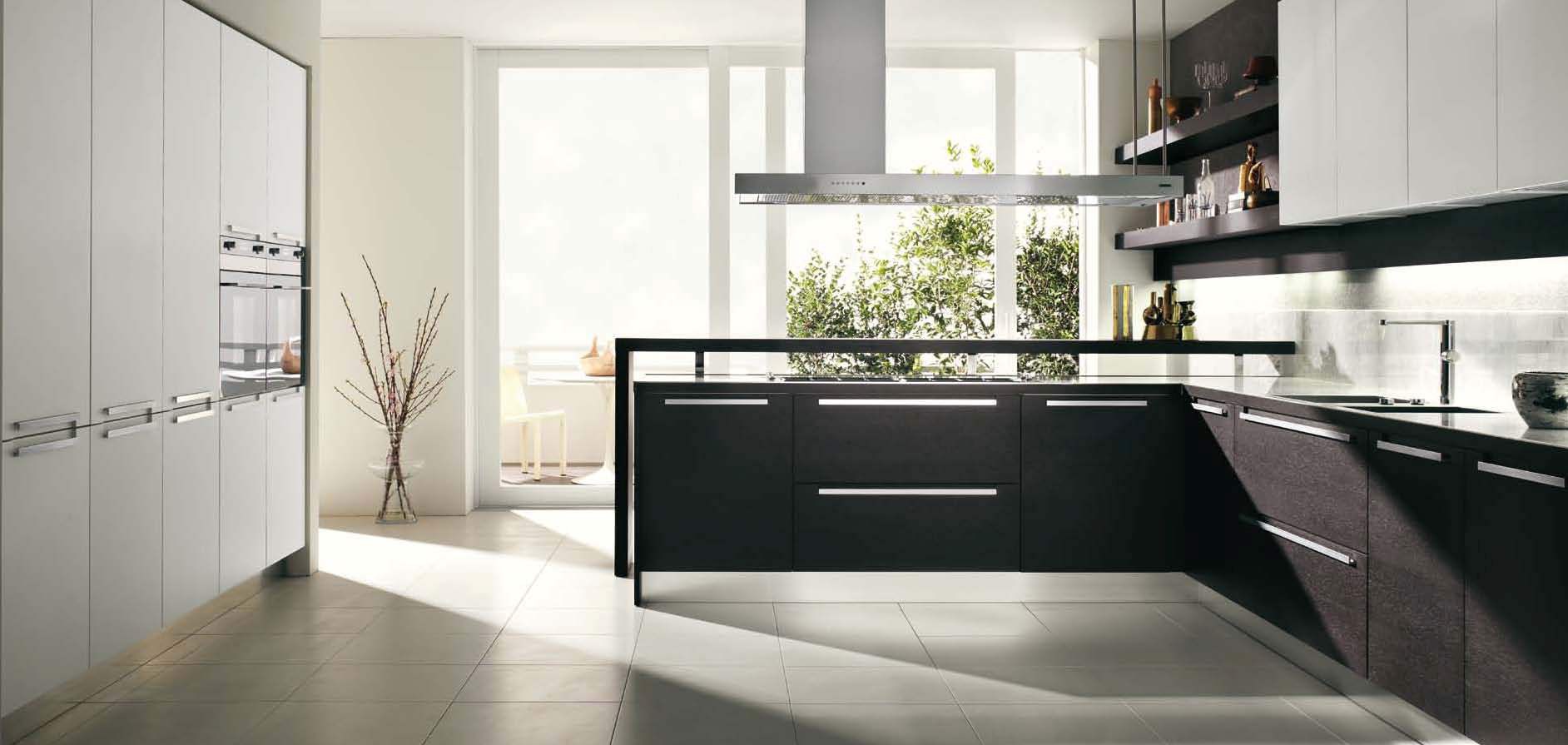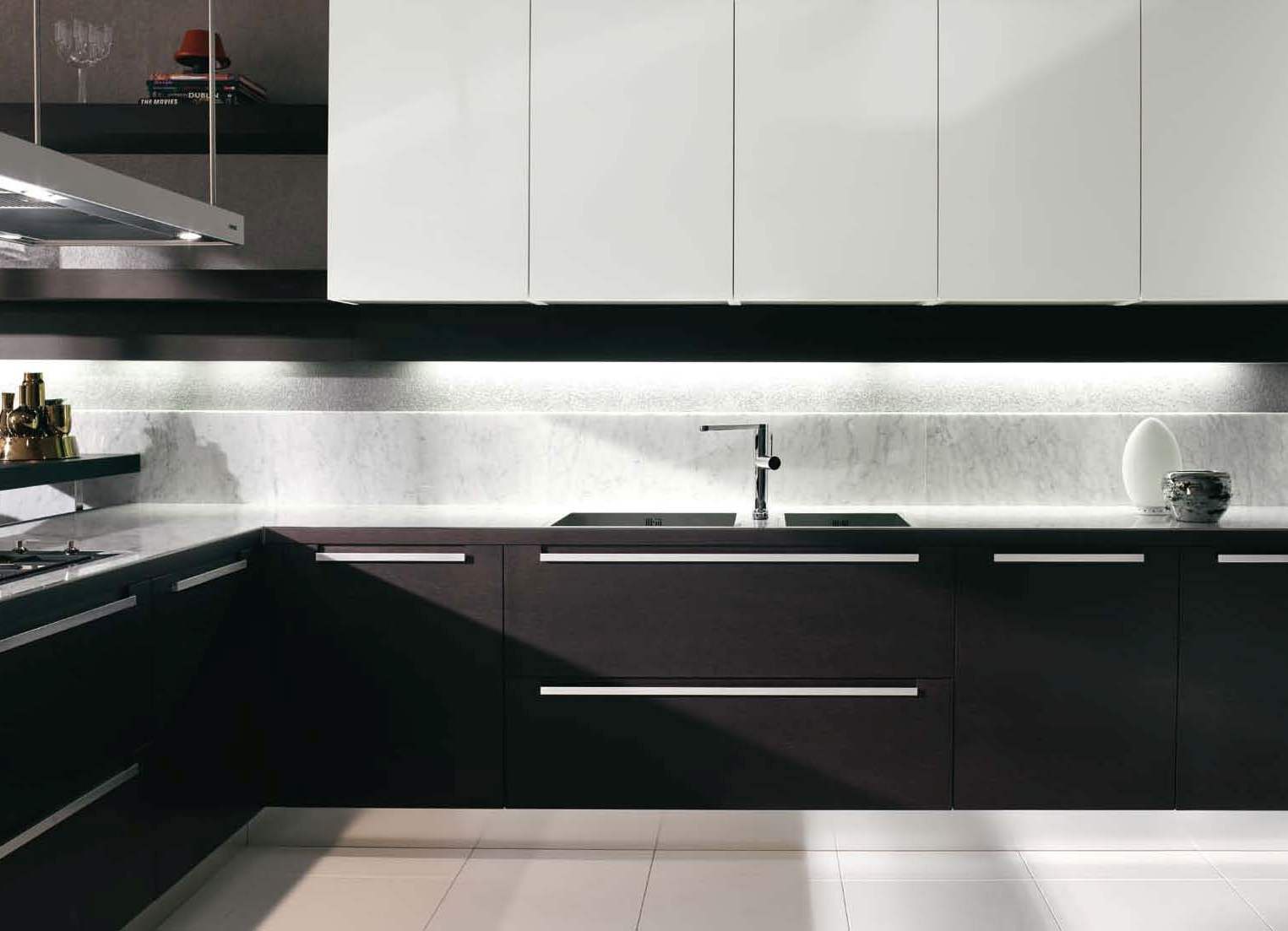 The Executive from Italian kitchen manufacturer Salvarani. The furniture is made in modern style. The headset frame is made of MDF, finishing sponem, worktop made of stainless steel. Wall of glass and aluminum, the surface is lacquered.