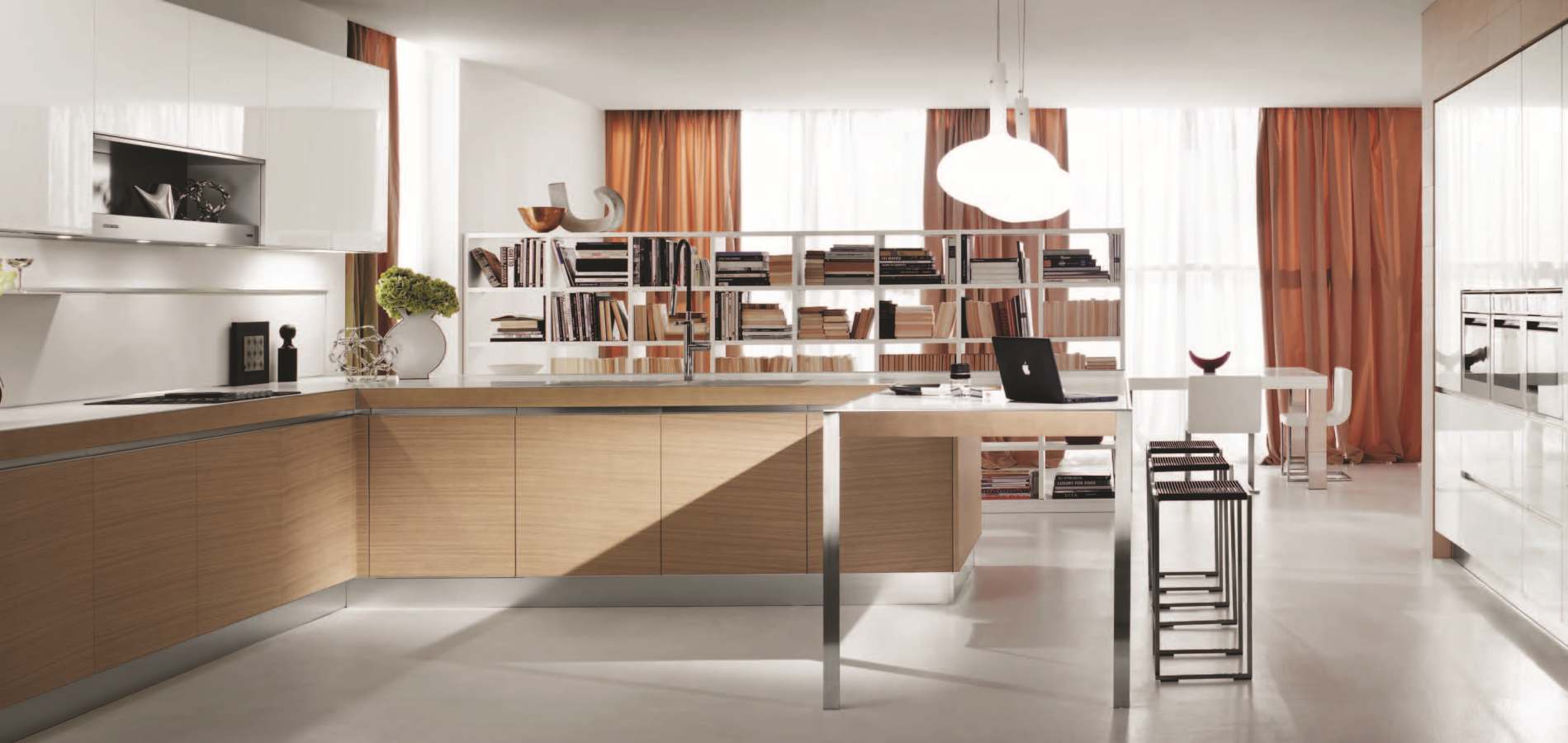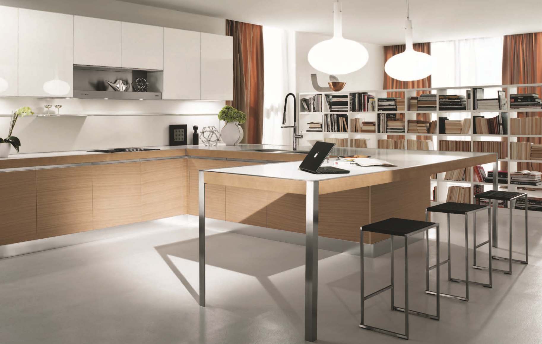 Slim kitchen by Italian manufacturer Salvarani. The headset frame is made of MDF, the facade was decorated with veneer and stainless steel. Countertop made of artificial stone. The presented model is made in a modern style.