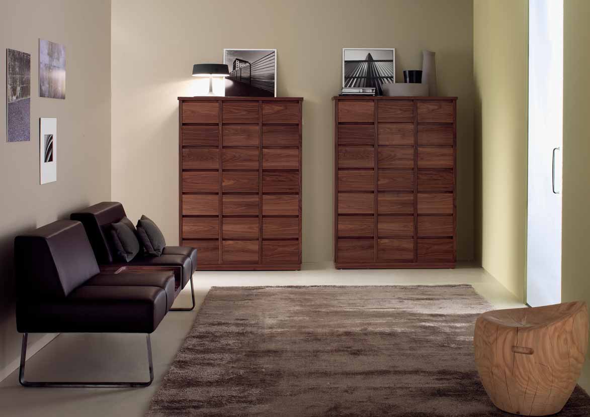 Sofa set from the Italian manufacturer Riva 1920. Includes dresser with drawers, sofa with built-in table. Frame and top made from solid wood. Seat and back are covered with skin. Color finish of your choice from the product range of the company. Set is manufactured in contemporary style.