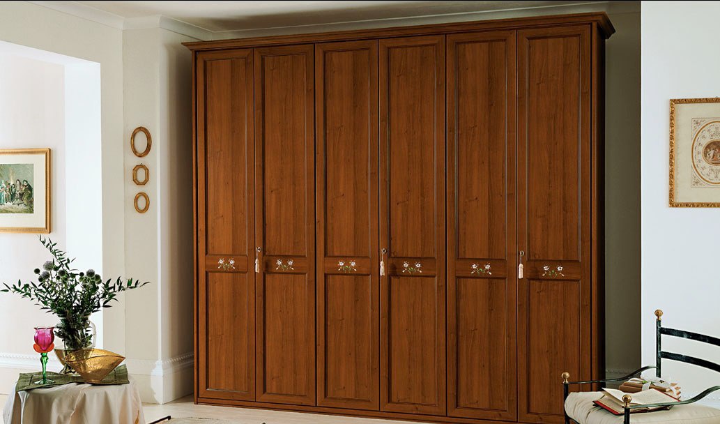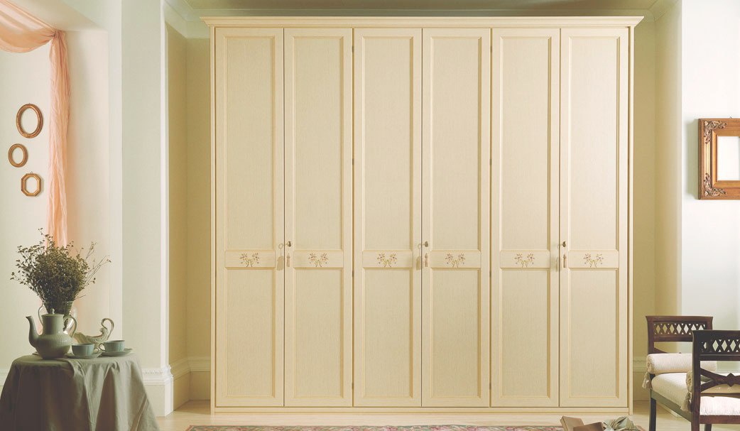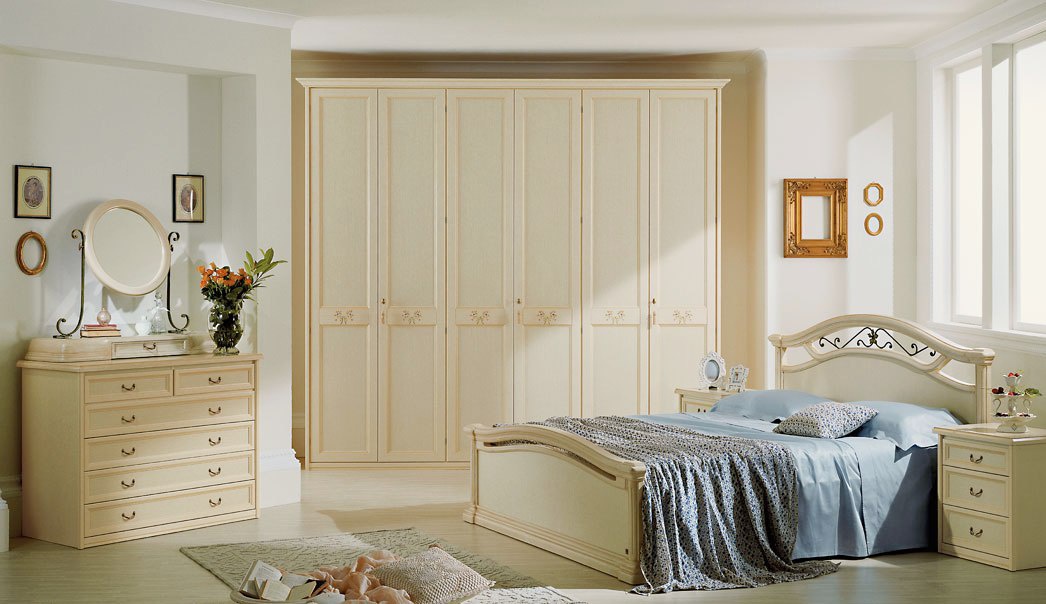 Headsets for bedrooms from Italian manufacturer Pentamobili. Set includes: double bed, wardrobe, bedside tables and chest of drawers. The furniture is made of solid wood. Finishing varnish from the range of the campaign. Decorative accessories - metal. Dresser and nightstand with drawers. Colors: ivory, natural wood color.