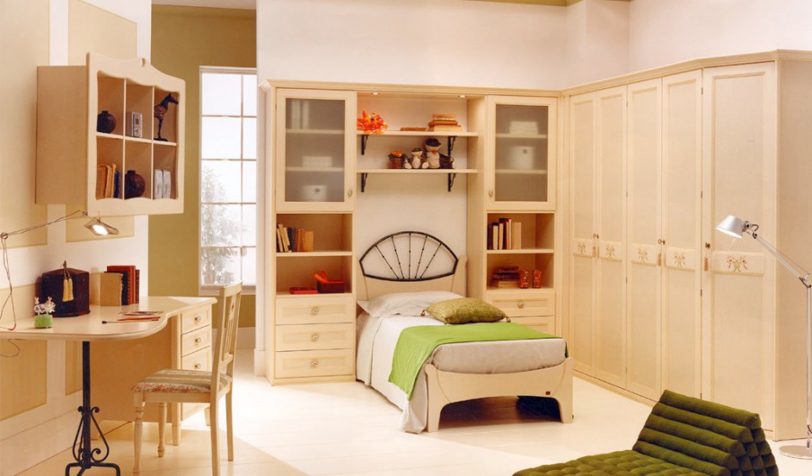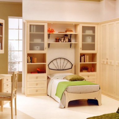 Headsets for children from the Italian manufacturer Pentamobili. Set includes: single bed, a chair, a Desk and a wall. The furniture is made of solid wood and metal. The upholstery - textiles. Finishing varnish from the range of the campaign. The side wall doors - frosted glass. Wall with storage space for books and clothes. Colours in stock.