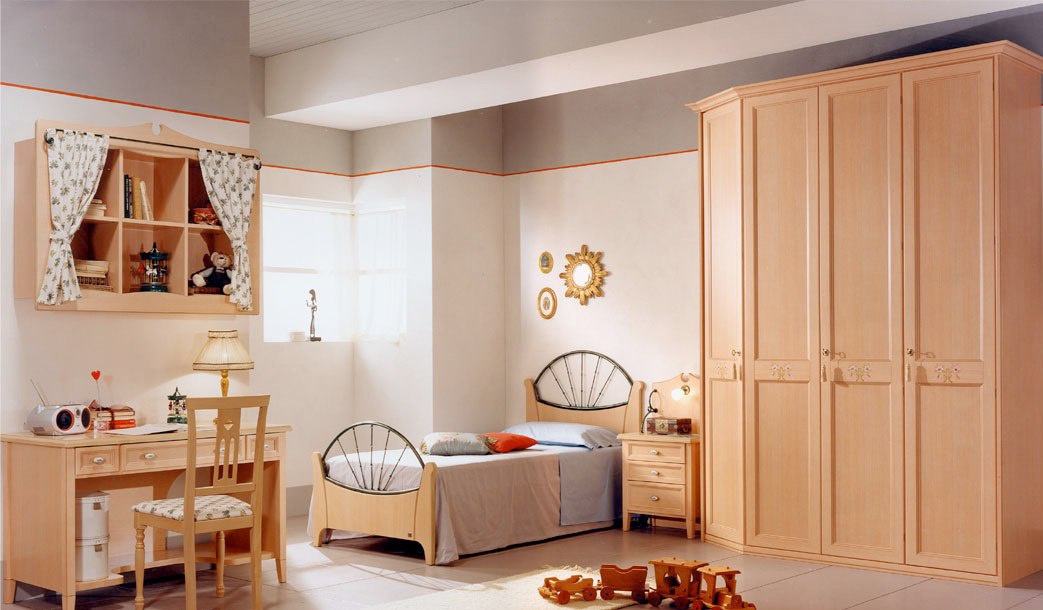 Headsets for children from the Italian manufacturer Pentamobili. Set includes: single bed, bedside table, wardrobe, chair, Desk and shelf. The furniture is made of solid wood. Headboard - metal. Table with drawers. Colours in stock.