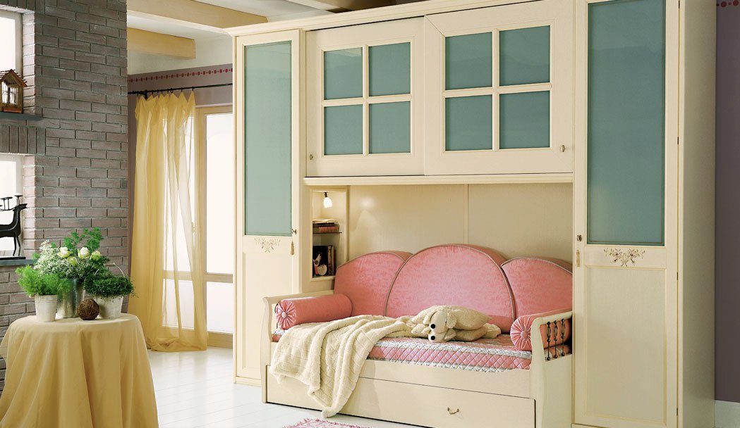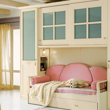 Headsets for children from the Italian manufacturer Pentamobili. Set includes: single bed and the wall. The furniture is made of solid wood. Upholstery - textiles from a range of campaigns. The doors - frosted glass. Bed with built-in storage box. The design of complementary decorative pillows and cushions. Colours in stock.