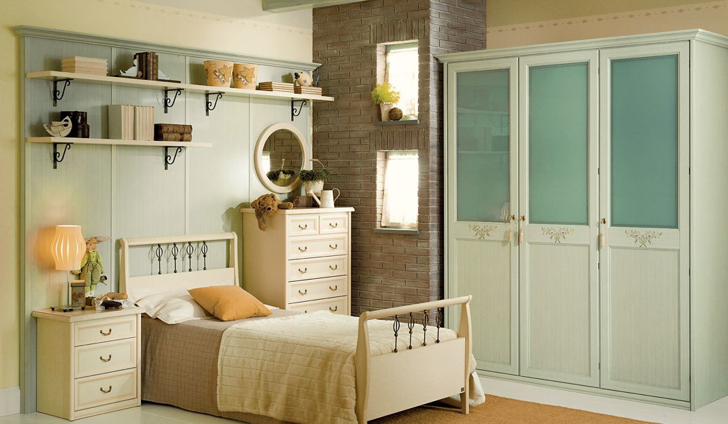Headsets for children from the Italian manufacturer Pentamobili. Set includes: single bed, wardrobe, bedside tables, chest of drawers and shelves. The furniture is made of solid wood. Decorative accessories - metal. Finishing varnish from the range of the campaign. Cabinet doors - frosted glass. Colors: white, ivory.