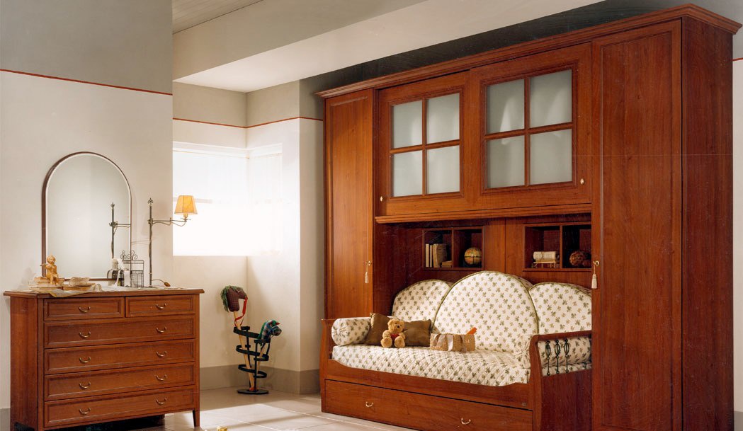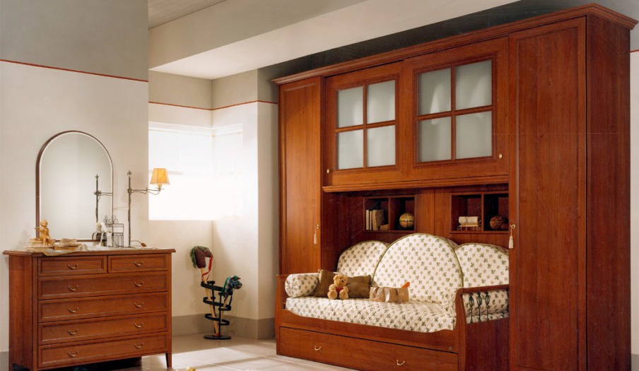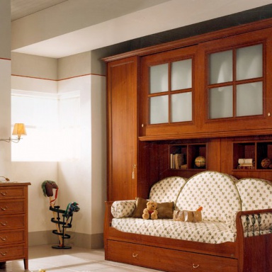 Headsets for children from the Italian manufacturer Pentamobili. Set includes: a wall, a single bed and a chest of drawers. The furniture is made of solid wood. Sash - glass. Decorative accessories - metal. Bed with built-in storage box. Upholstery - textiles from a range of campaigns. The design of complementary decorative pillows and cushions. The color of natural wood products.
