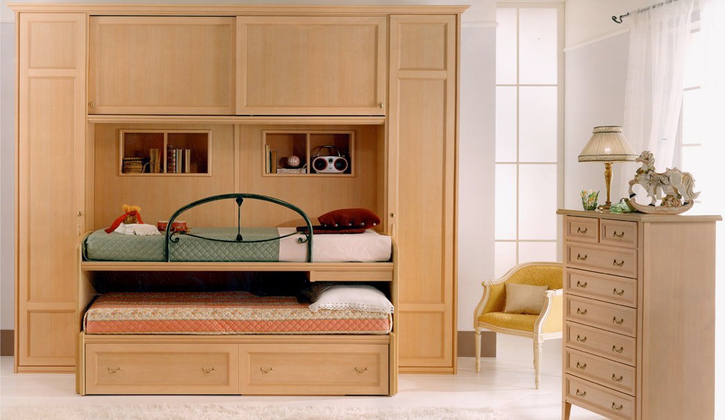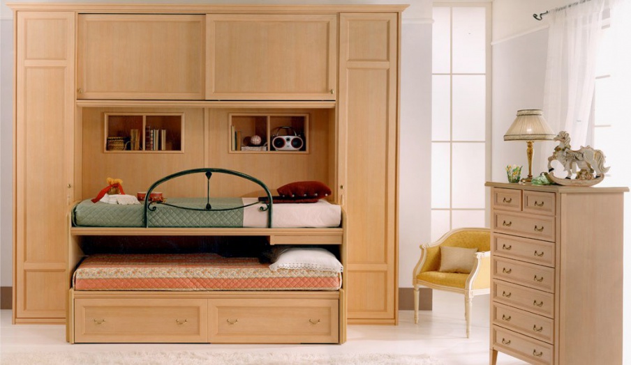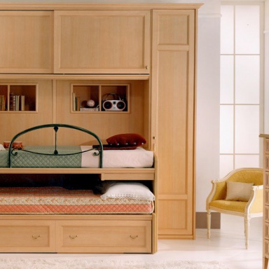 Headsets for children from the Italian manufacturer Pentamobili. Set includes: bunk bed, the wall and the dresser. The furniture is made of solid wood. Bearing and fittings - metal. Dresser with drawers. Bed with built-in storage box. Colours in stock.