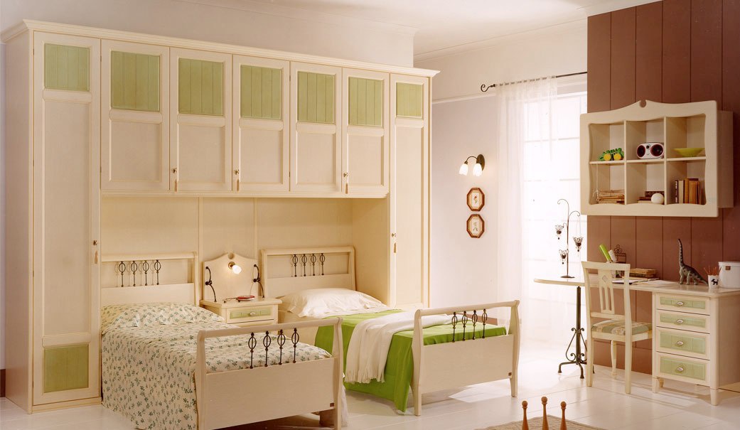 Headsets for children from the Italian manufacturer Pentamobili. Set includes: twin bed, dresser, Desk and modular storage system. The furniture is made of solid wood and metal. Bedside table with built-in illumination. Colours in stock.