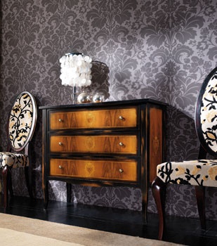 Chest of drawers Italian manufacturer Tosato. A chest of drawers on small feet made of wood. Light color natural wood with black accents. Model in the classic style.
