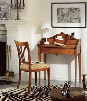 Bureau from the Italian manufacturer Tosato. Model on wooden frame with high legs. The color of natural wood. Equipped with pull-out drawers. A style classic.