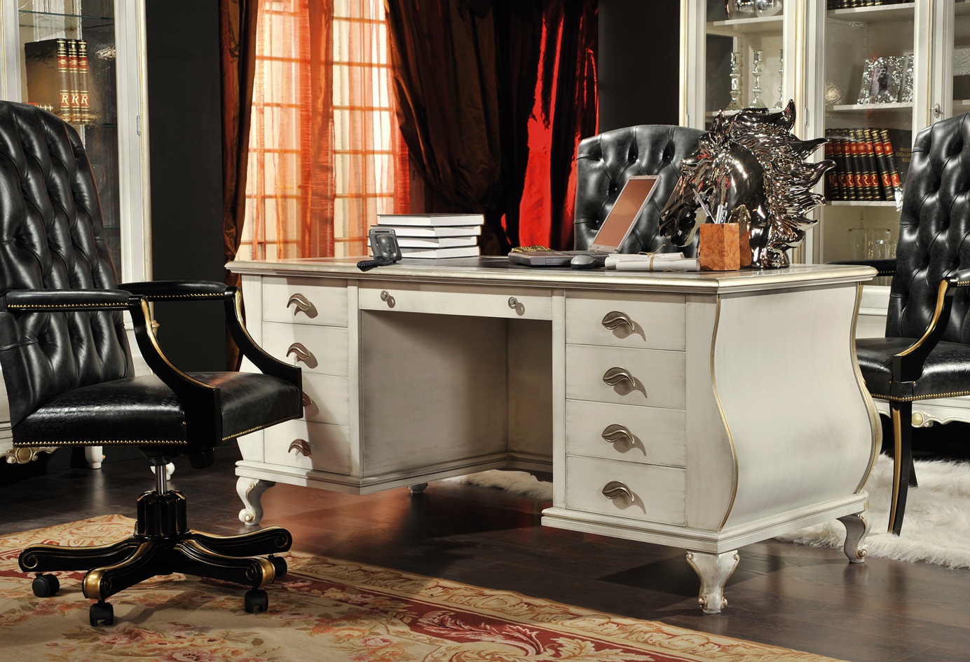 Headsets for the office from the Italian manufacturer Mirandola Export. Set off: a Desk, a swivel chair with wheels, chairs with armrests, a showcase and a sideboard. The furniture is made of solid wood. Finish options: carved/Polish/gold plating. Upholstery of chairs and seats - natural leather. Sideboard with drawers. Colors: white, black, red.