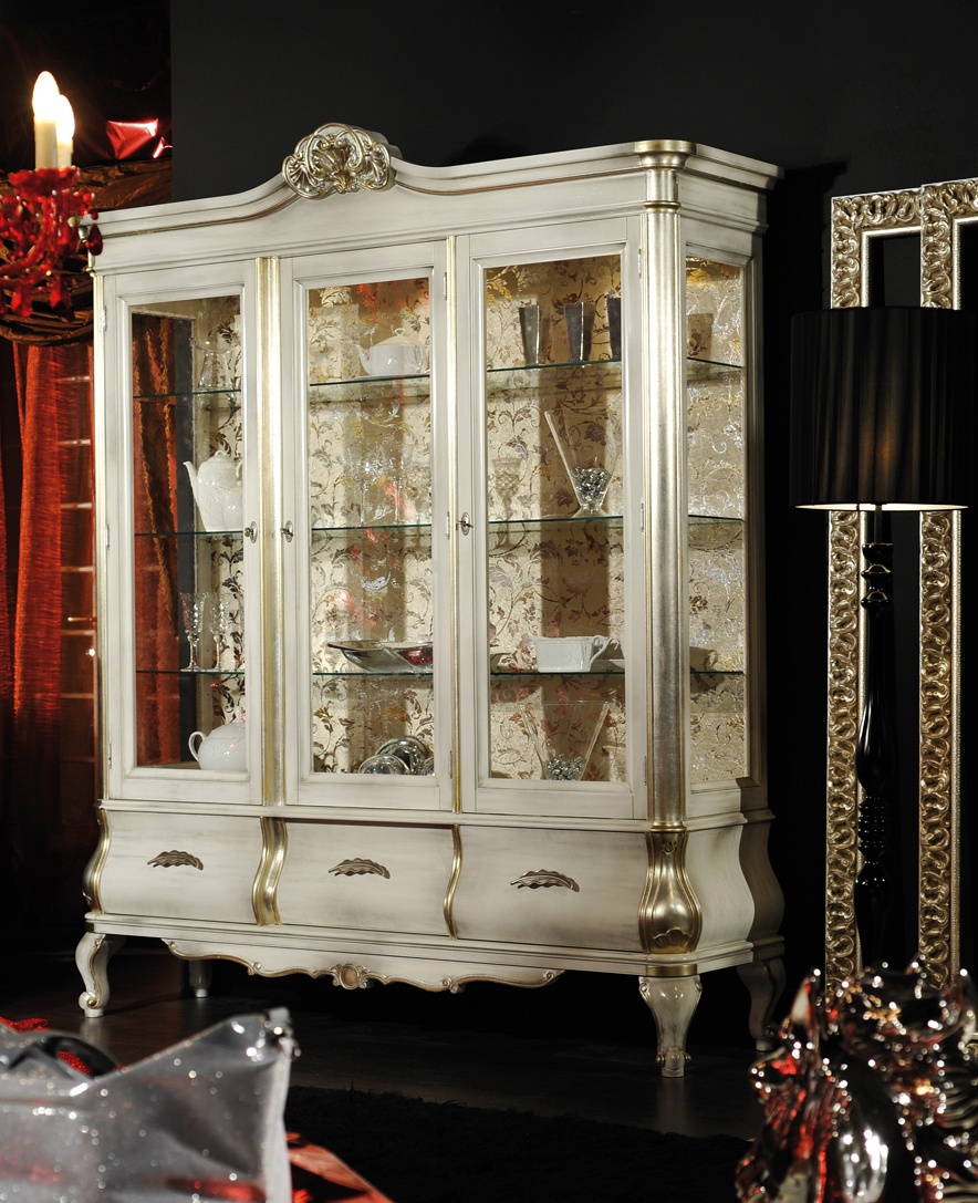 frame: solid wood upholstery: natural stone doors, shelves: glass finish: carved finish: lacquered finish: gilding |