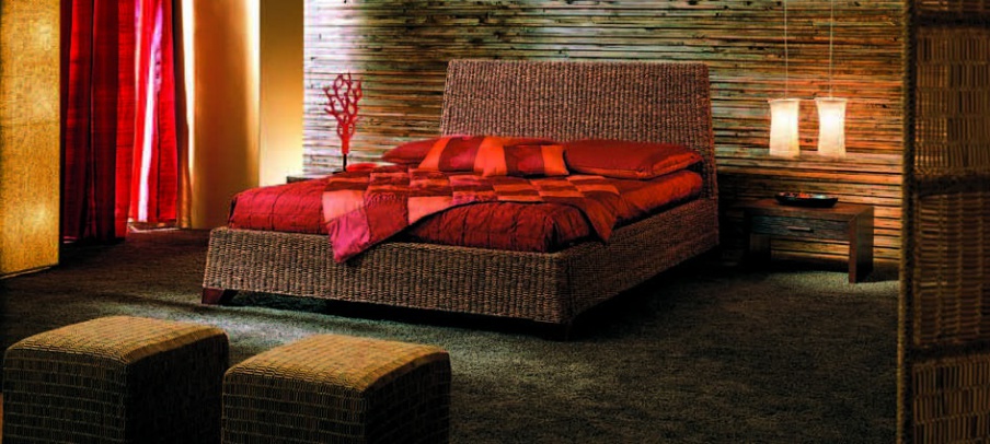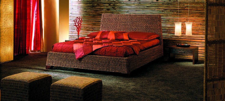 Double bed from Italian manufacturer Roberti Rattan. Model on low legs made of solid wood. The frame and headboard adorned with decorative netting from Rattana. Finish to choose from a range of firms. The model is characterized by modernity, strength and comfort.