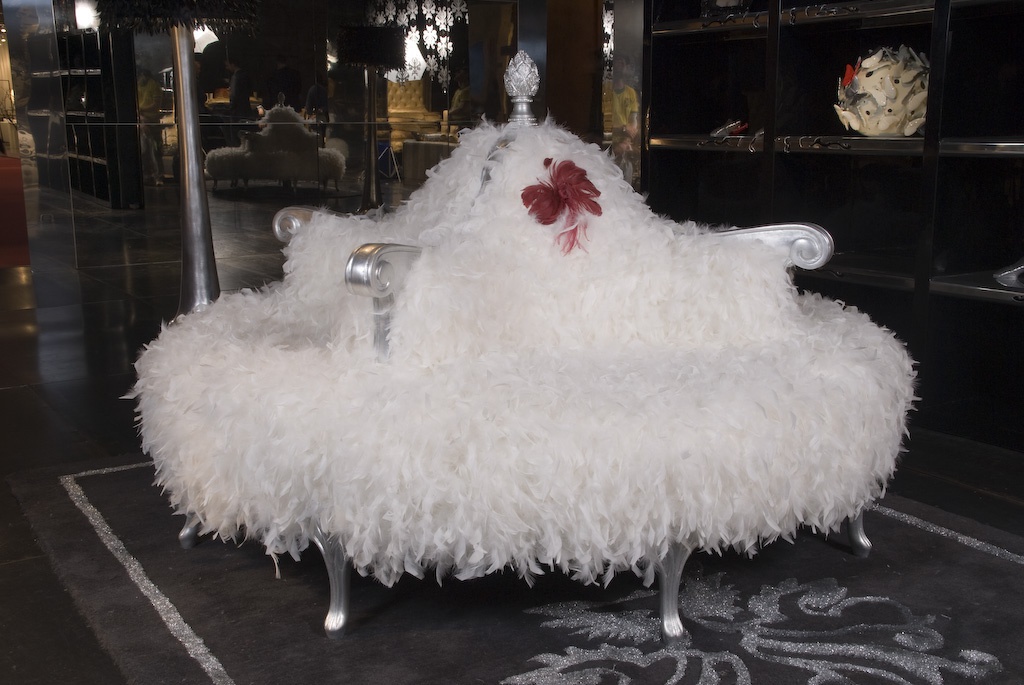 A Butterfly sofa from Italian manufacturer Mantellassi. The frame is made of wood. Upholstery - textiles. The model is made in the shape of a circle. Thus on each side - one Seating position. Colors - silvery and white. The model is made in modern style.