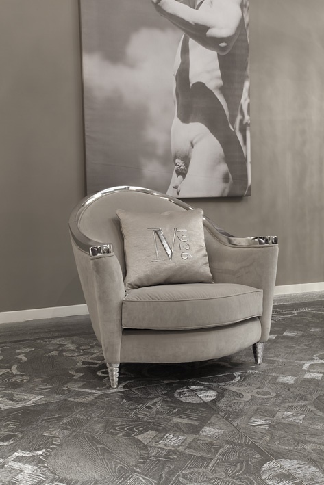 Chair La Perla, the Italian manufacturer Mantelassi. the frame is made of wood. Upholstery - textiles from the company portfolio. Colors - beige. Back smoothly into the armrests. The design is complemented by a decorative pillow.