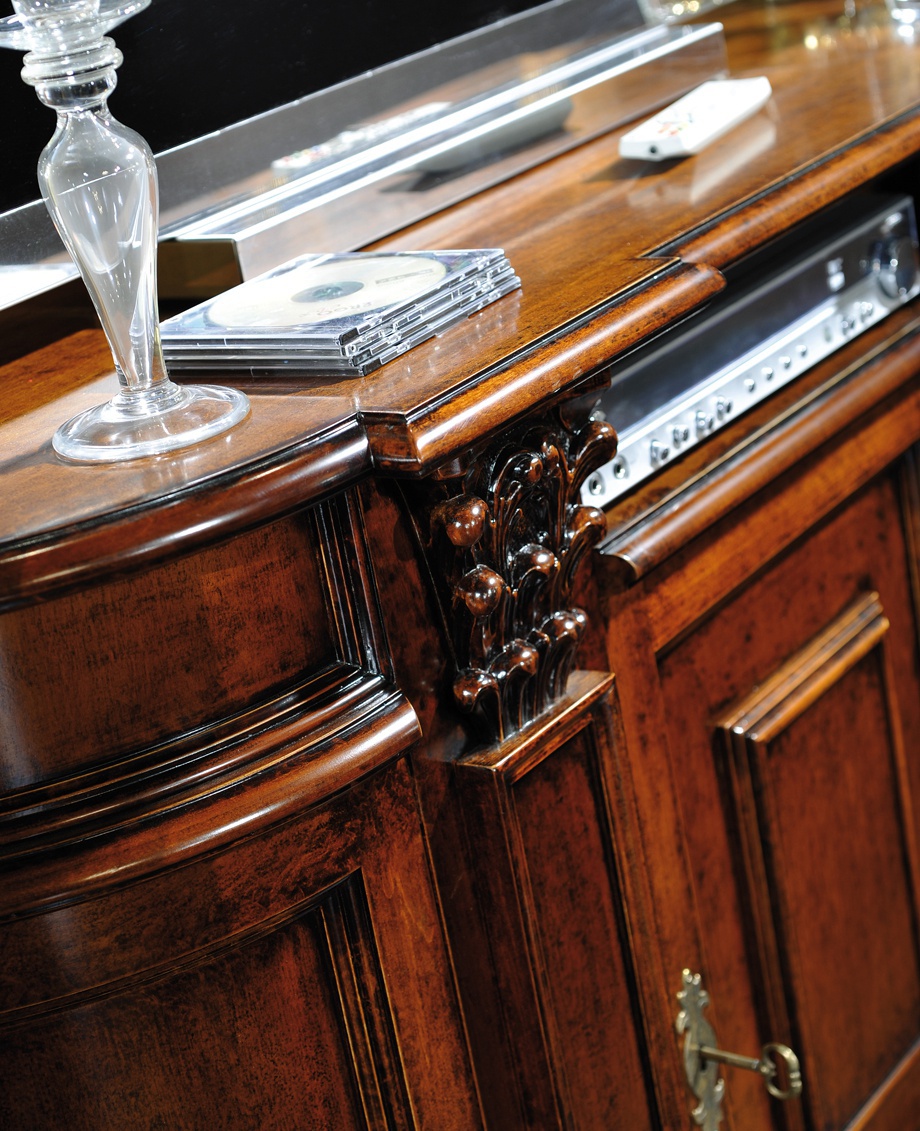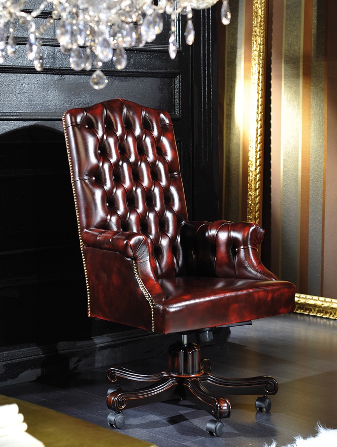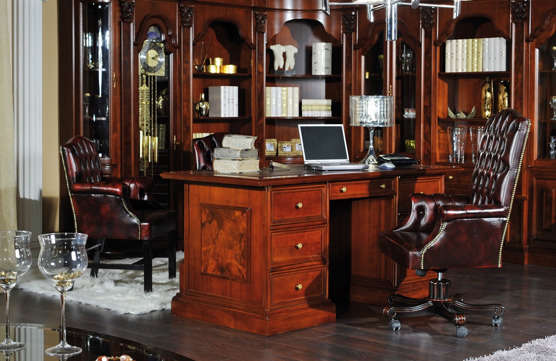 Headsets for the office from the Italian manufacturer Mirandola Export. Set includes: modular system for TV, a Desk and a chair. The furniture is made of solid wood. Central door wall - glass. A chair on wheels. Upholstery - leather. Finish - gloss lacquer. Table with drawers. The color of natural wood products.