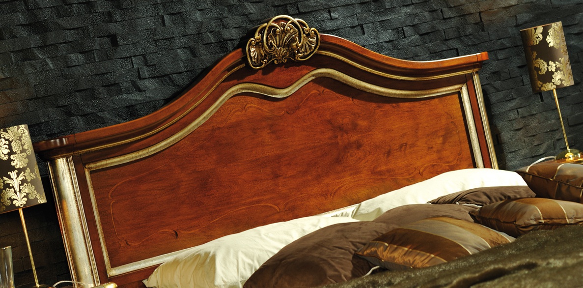 Headsets for bedrooms from Italian manufacturer Mirandola Export. Set includes: double bed with high headboard, bedside tables, wardrobe and Desk. The furniture is made of solid wood. The Central Cabinet door mirror glass. D?cor - gilding. Finish - gloss lacquer. The color of natural wood products.