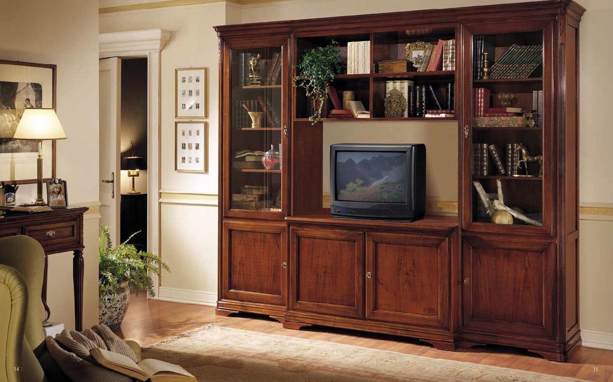 Modular storage system from Italian manufacturer Mirandola Export. The body is made of solid wood, finished with glossy varnish. Side door glass. Module for books and TV. The wall is designed for the living room in a classic style. Product color natural wood.