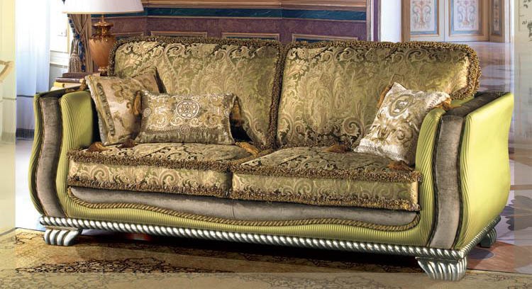 The Miro sofa from Italian manufacturer Lunardelli. The frame is made of wood. Upholstery - textiles from the company portfolio. Design complete the pillow. Carved legs covered in silver. The model is made in classic style.