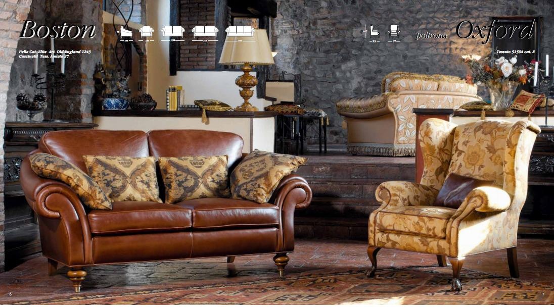 Italian sofa set of Lunardelli production. Set includes: sofa and chair. The frames are made of wood. Upholstery - leather and textile with floral ornaments from the company portfolio. The legs are decorated with carvings. Set is made in a classic style.