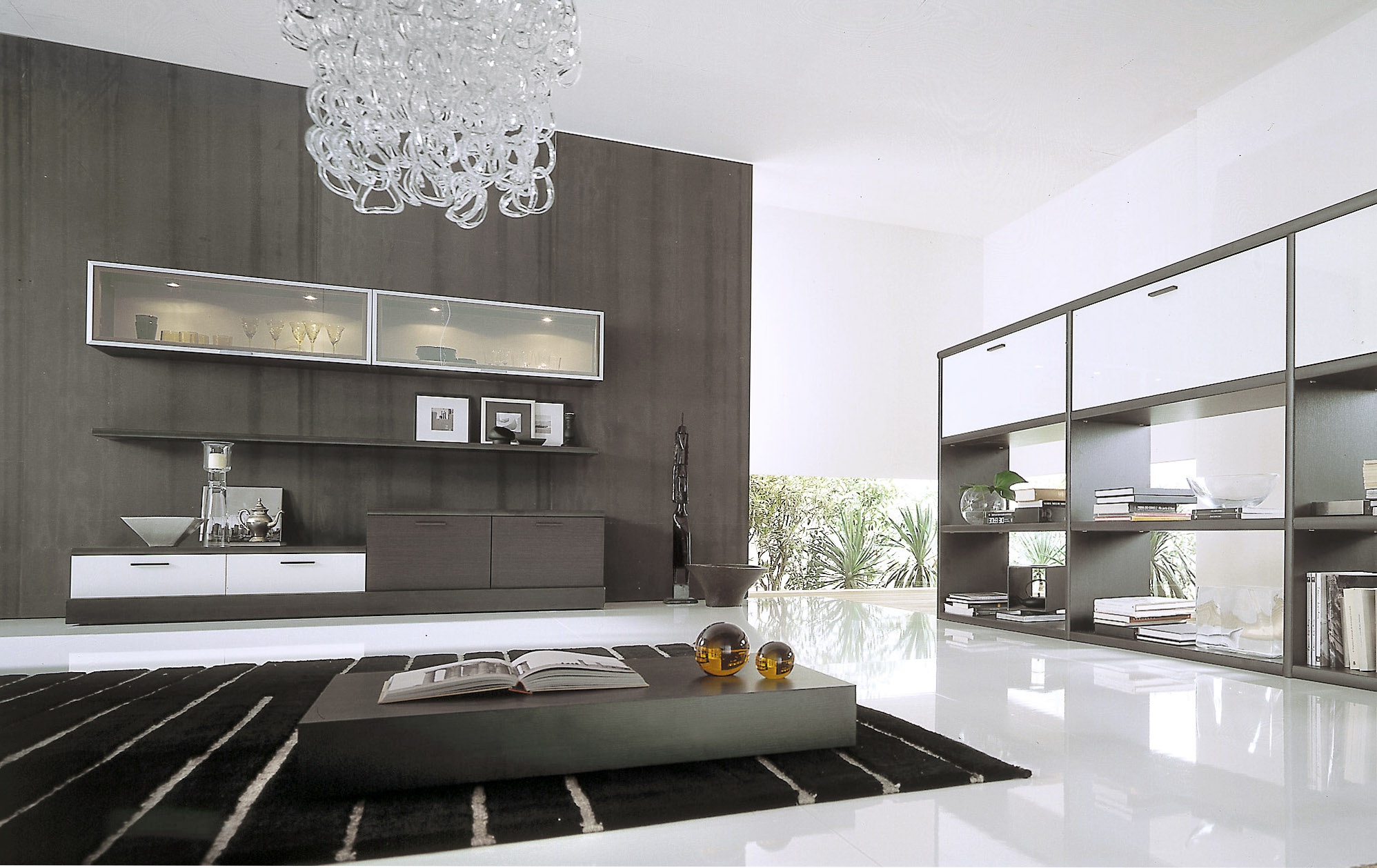 Modular system from Italian manufacturer Santarossa. The model consists of closed sections and open shelves. The frame is made from solid wood. Finish to be selected from the range of the company. Handles made of chromed metal. Sliding sash with glass. The model is made in a modern style.