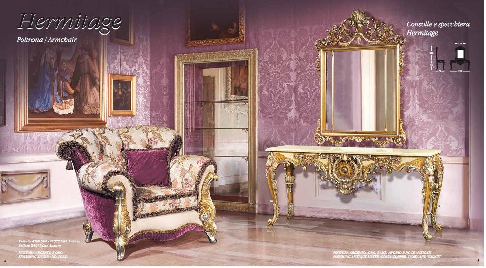 Italian sofa set of Lunardelli production. Set includes: chair and console. the frames are made of wood. Upholstery - textiles from the company portfolio. Finish - gold and silver. Set is decorated with carved elements. The model will perfectly complement the classic interior of the living room.