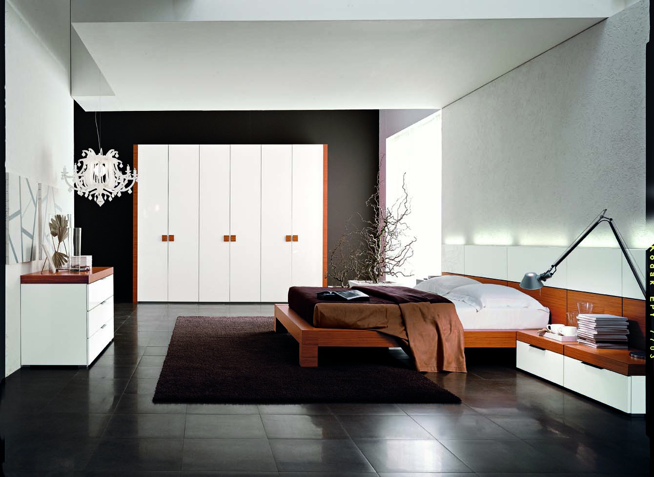 Bedroom from the Italian manufacturer Santarossa. Includes double bed, wardrobe, bedside tables and chest of drawers. Material = solid wood. The finish is offered in white, black or natural wood color. Upholstery textile to choose from a range of companies. Set is manufactured in contemporary style.