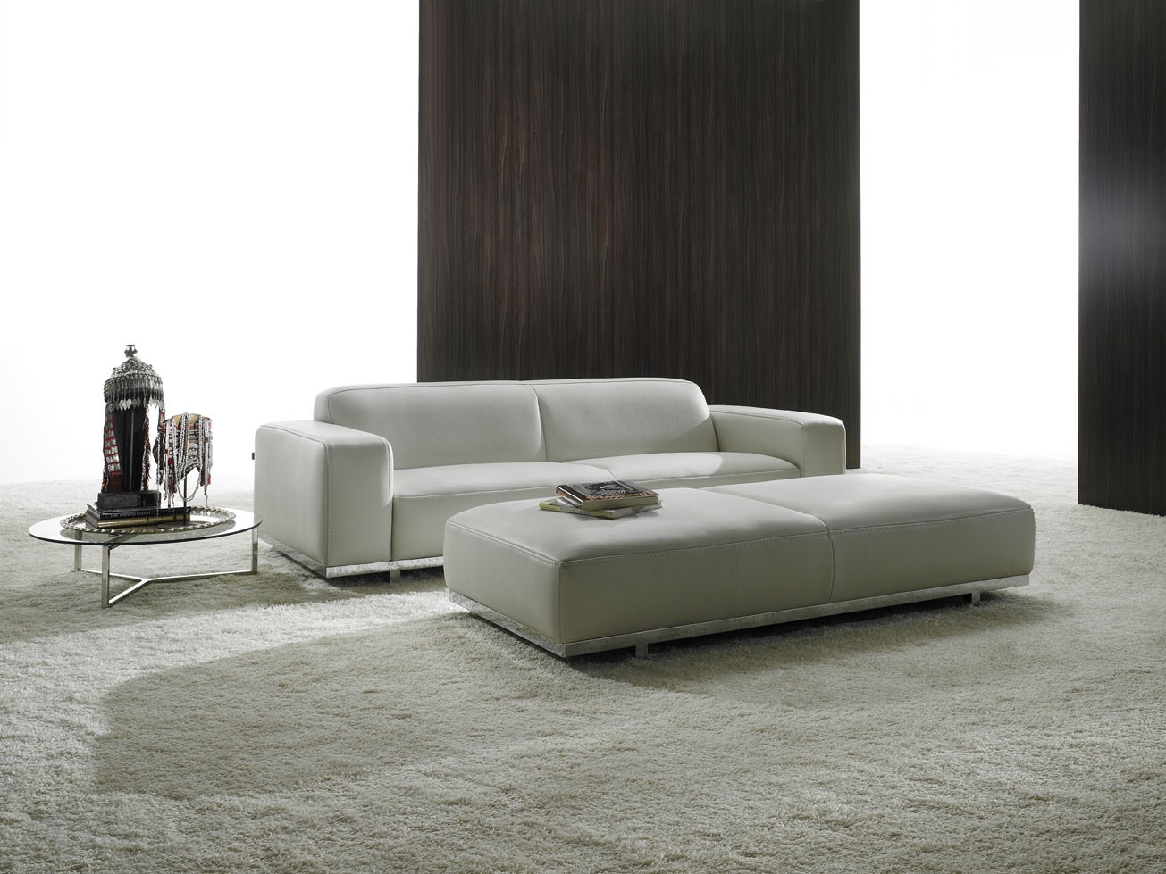 Sofa set from the Italian manufacturer Polaris. Set includes: coffee table, loveseat and a pouf table. The frame is made of metal. Filler - polyurethane foam. Upholstery - leather. The seats are removable. The color of products is white.
