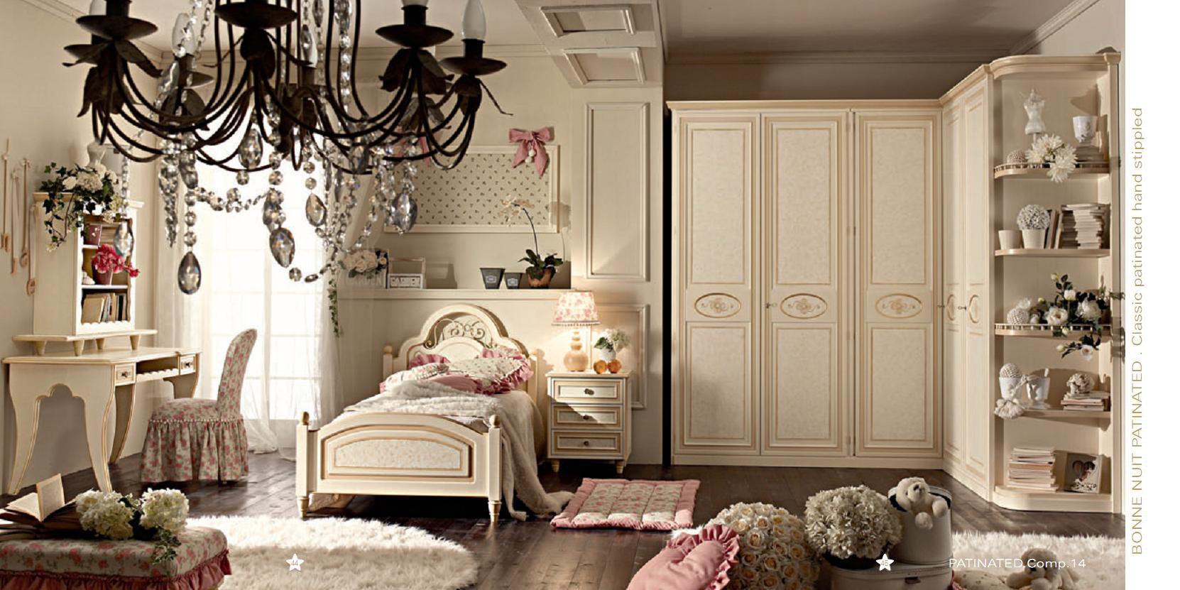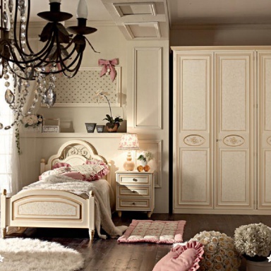 Headsets for children from the Italian manufacturer Ebanisteria Bacci. Consists of single beds, table, wardrobe and open shelves. Material - solid wood. Finish option to be selected from a catalog company. Handles are metal. Each model is carved.