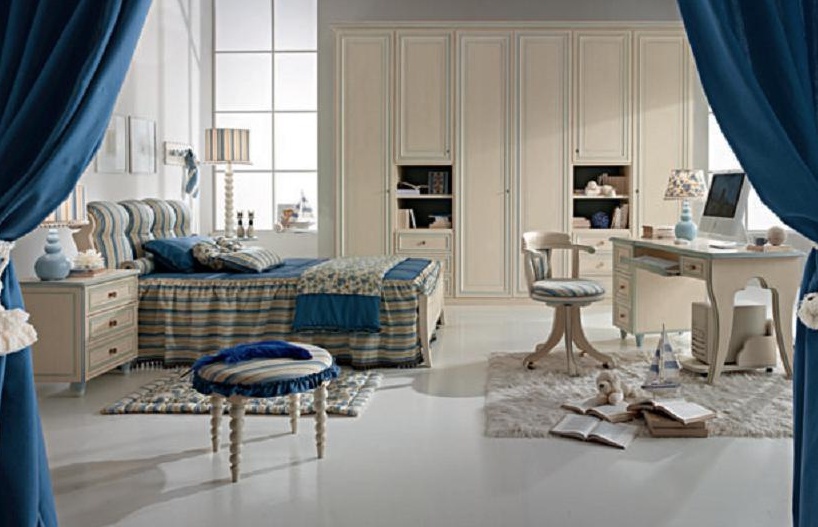 Headsets for children from the Italian manufacturer Ebanisteria Bacci. The set includes a bed with upholstered headboard, bedside table, Desk, chair, stool and a wardrobe. Frames made from solid wood. Upholstery textile from the company portfolio. The finish offers a matte varnish.