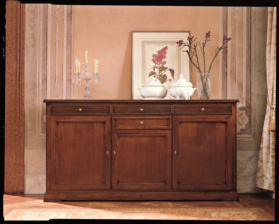 A chest of drawers from Italian manufacturer Santarossa. The model consists of drawers and partitions with swinging doors. The frame is made from solid wood. Finish to be selected from the range of the company. Decorative metal fittings of Golden color. The chest is made in a classic style.