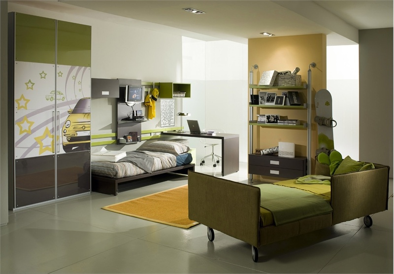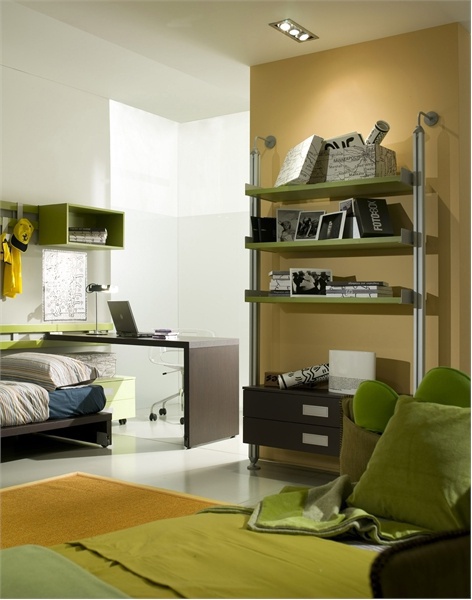 Headsets for children from the Italian manufacturer CIA International. Set includes: two single beds, wardrobe, bookcase, Desk and shelves. The furniture is made of solid wood and metal. Beds on wheels. The design complements the decorative pattern on the doors of the Cabinet. Color green products.