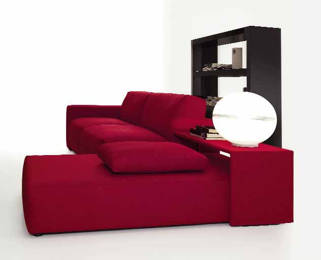Corner sofa from Italian manufacturer Pol 74. The frame is made from solid wood to fabric from a range of campaigns. The backrest is removable. Model with built-in table. A chic choice for the living room in a modern style. Product color red.
