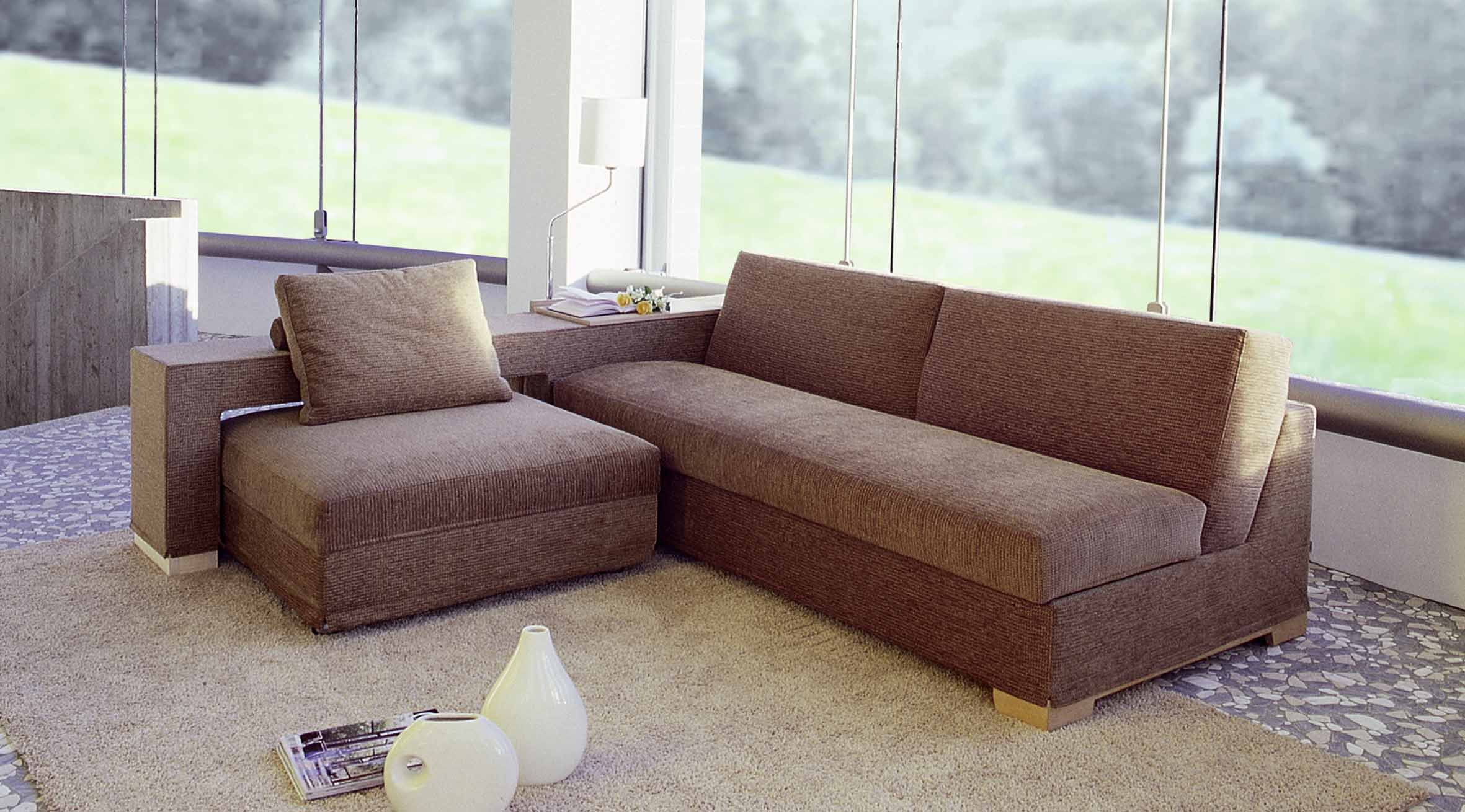 Corner sofa from Italian manufacturer Pol 74. The frame is made from solid wood. The model is fully upholstered in fabric from the range campaign. Seat and back are removable. Sofa with built-in shelf/table. The set includes a stool of square shape. Colors: white, brown.