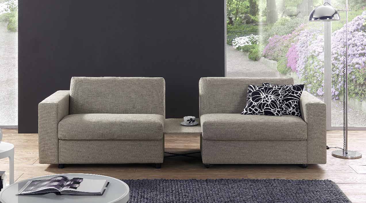 Two-seater sofa from Italian manufacturer Pol 74. The frame is made from solid wood, upholstery - textiles from a range of campaigns. Model with built-in table. Table is located in the middle. The design of complementary decorative pillows. The sofa will adorn the living room in modern style. Product color grey.