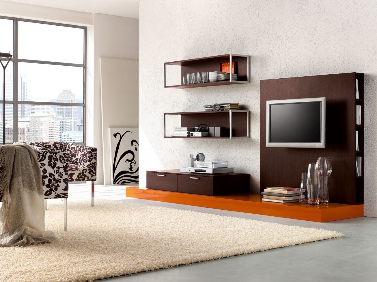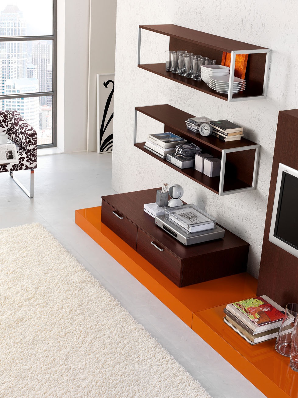 Modular system from Italian manufacturer Santa Lucia. The model is made in modern style. Attracts attention with its original design. Module frames are made of solid wood and metal. Finish offered a choice from a range of companies. Drawers complemented with metal handles. There is a place for TV.