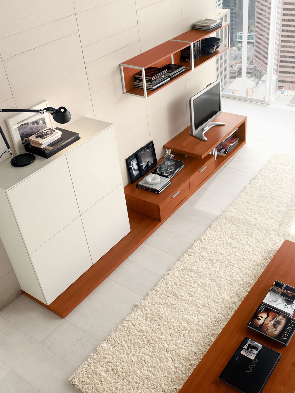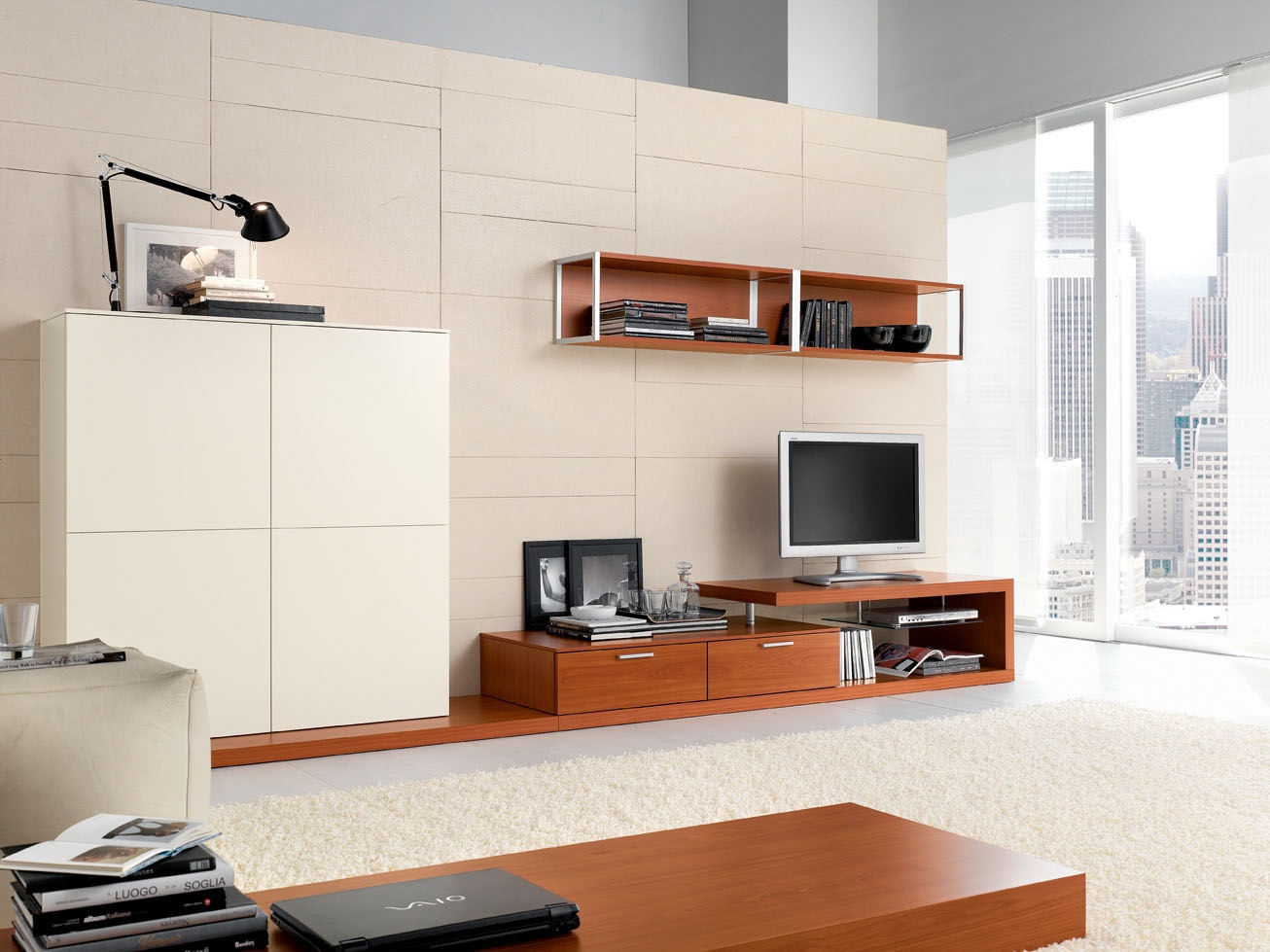 Modular system from Italian manufacturer Santa Lucia. The model consists of several closed cabinets, drawers and shelves. In the presence of a place for TV. Profile and handle in chromed metal. Panel made of solid wood. The surface is covered with a varnish or veneer. The model offers spaciousness and practicality.