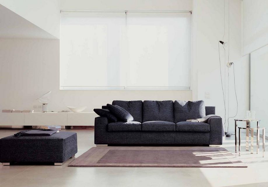 The Rene sofa from Italian manufacturer Seven Salotti. The frame is made of wood. The legs are metal. Upholstery made of gray textile. The design of complementary decorative pillows. The model is made in modern style.