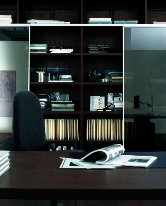 Headsets for the office from the Italian manufacturer Santa Lucia. Includes Desk, Desk chair and bookcase. Frames models made of solid wood. Finish to be selected from the range of the company. Legs and metal fittings. Sliding doors made of glass. Textile upholstery in black. The base of the chair complement the wheels. Set is manufactured in contemporary style.