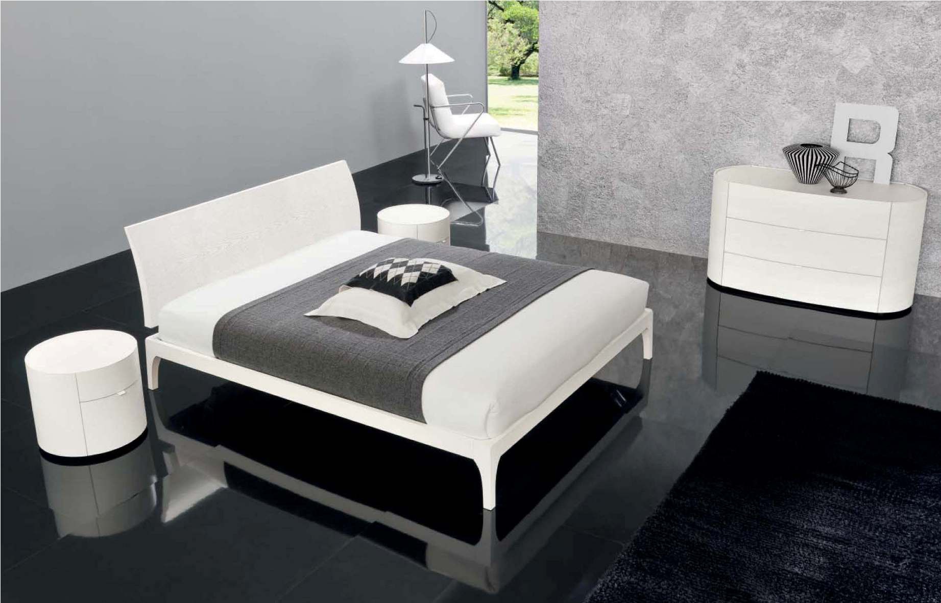 Italian furniture for bedroom production of Veneran. Set includes double bed with high headboard round bedside tables and chest of drawers. The frames are made of solid cherry. Treatment white lacquer. The bedroom is designed in modern style.