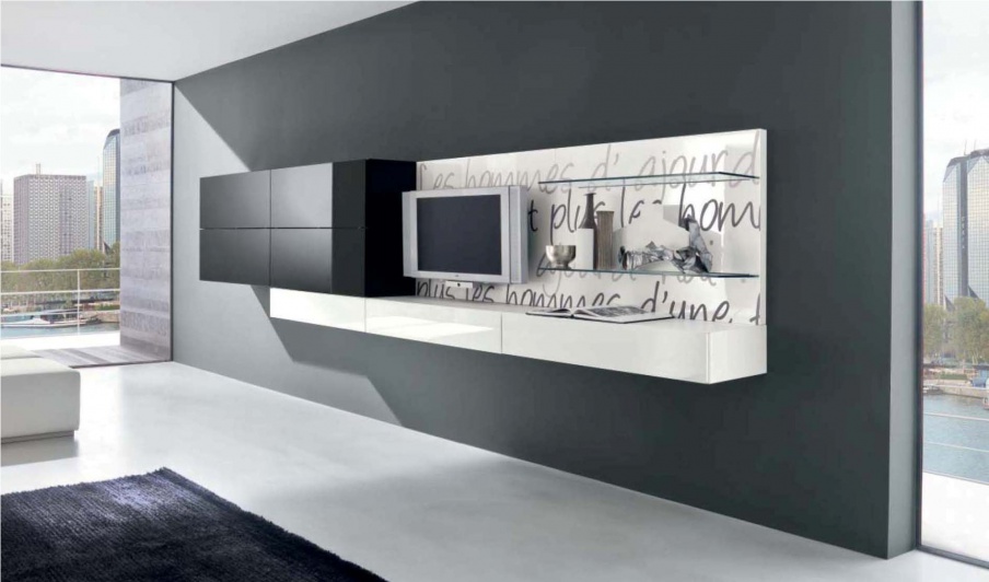 Furniture for TV Italian manufacturer of Veneran. Modern design approach, convenient shelves for storage drives and other accessories for TV. System hanging, wall. Color scheme in the combination of two contrasting shades of white and black. Made in a modern style.