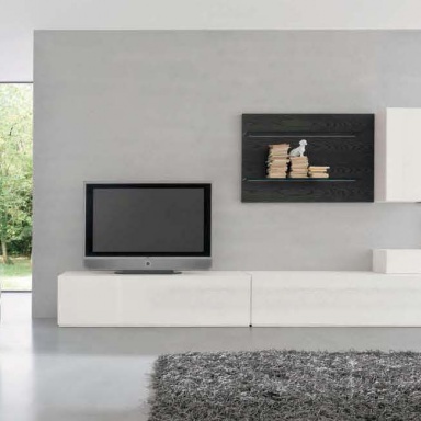 Furniture for TV Italian manufacturer of Veneran. Presents a modern system for TV. Consists of shelves and wall cabinets for storage drives and other accessories for TV. The system presented in the white version, it is possible to select colors in stock.
