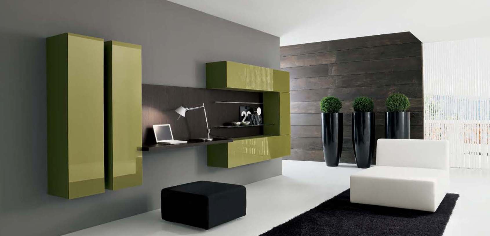 Furniture for TV Italian manufacturer of Veneran. Presents a modern system for TV which consists of shelves and wall cabinets for storage drives and other accessories for TV. The system presented in green with black version, it is possible to select colors in stock.