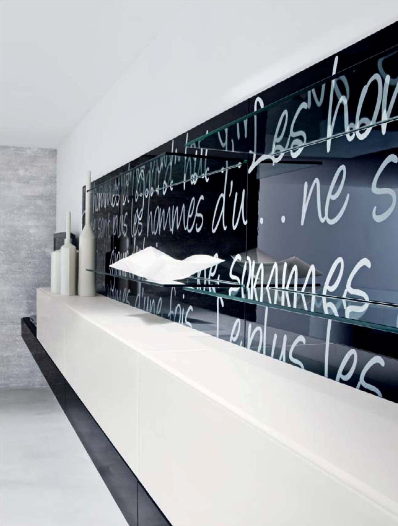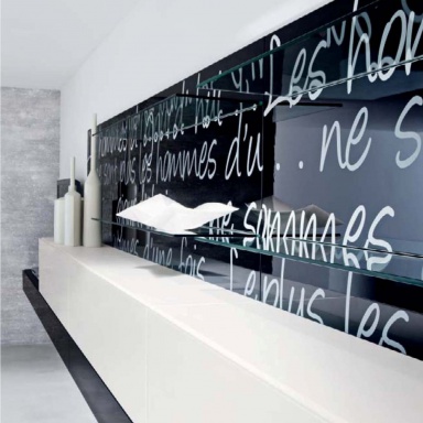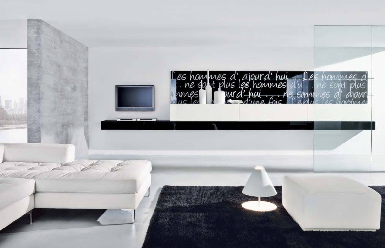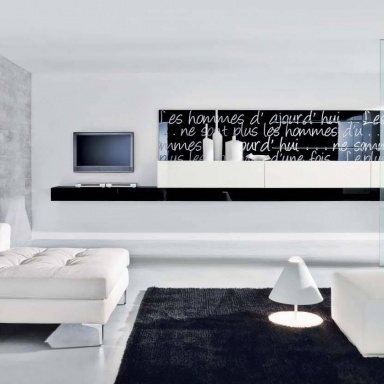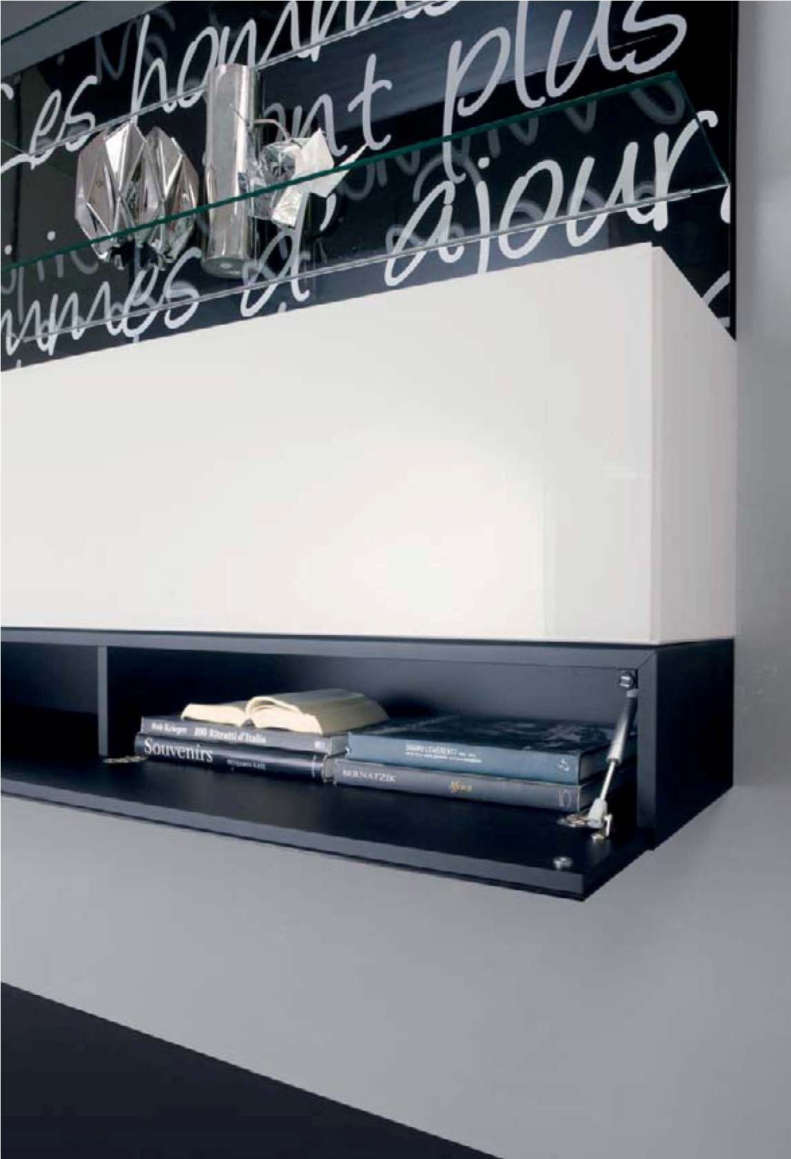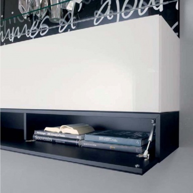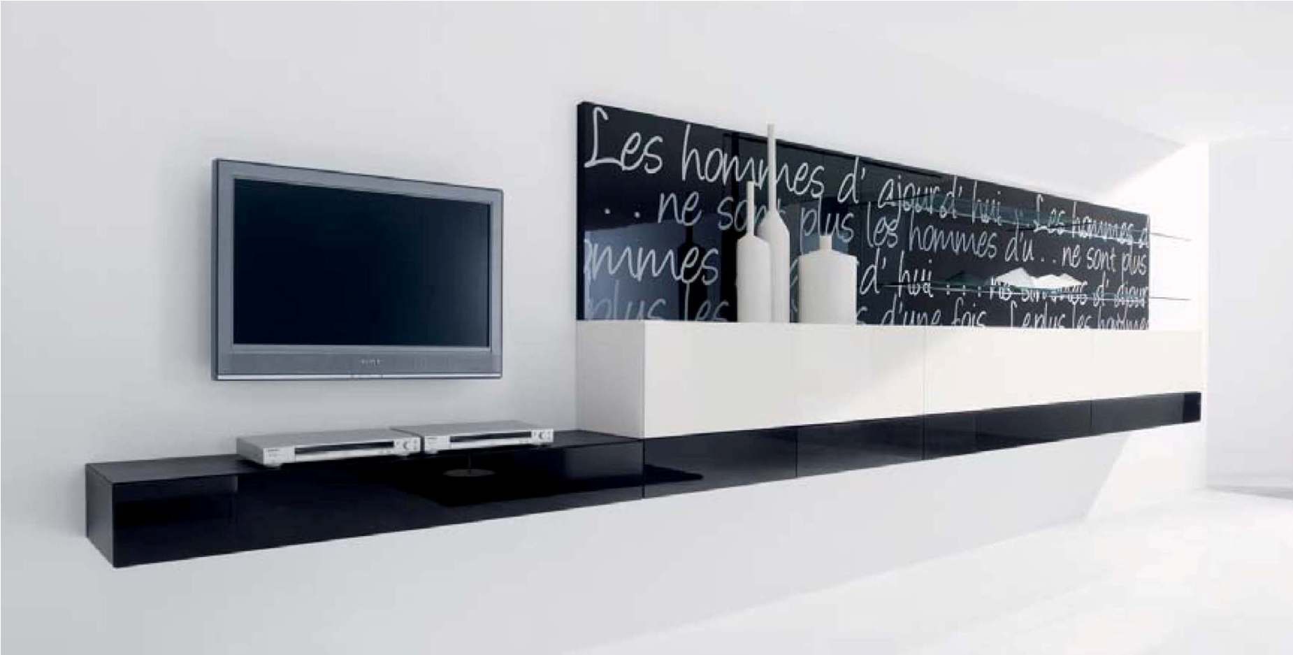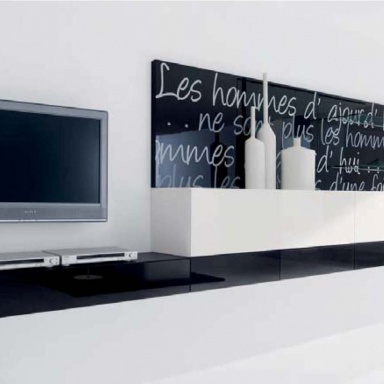 Furniture for TV Italian manufacturer of Veneran. Presents a modern system for TV. Consists of glass shelves and wall cabinets for storage drives and other accessories for TV. The system presented in white with black, as it is possible to select colors in stock.