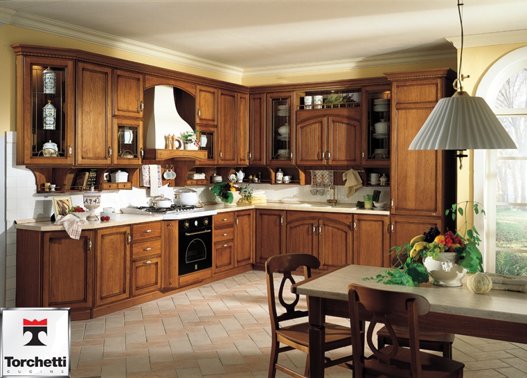 Set for the kitchen from Italian manufacturer Torchetti. The model is made of solid wood. Finish to be selected from the range of the company. Handles made of metal. Wing lockers are deaf or glazed. Tops made of natural stone or laminate. In addition, it is proposed a dining table and chairs. Set is manufactured in contemporary style.